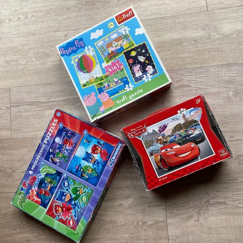 6 gode puslespil til lidt forskellige aldersgrupper: Disney Cars (4+), 4 med dinosaurer (6+), et 3D med dyr mm.