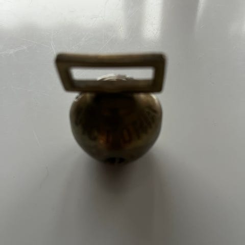 Gammel klokke, fantastisk klang, med læder på håndtag.