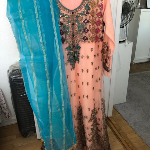 Rigtig flot pakistansk / indisk maxi kjole i størrelse S/M. Medfølger sort sjal og bukser. Kan sendes eller afhentes.