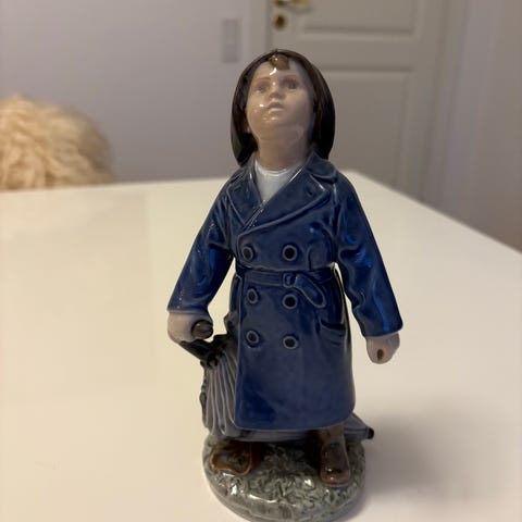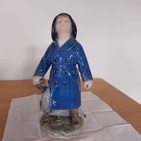 Flot figur fra Royal Copenhagen i form af dreng med paraply, som spejder efter om regnen kommer.