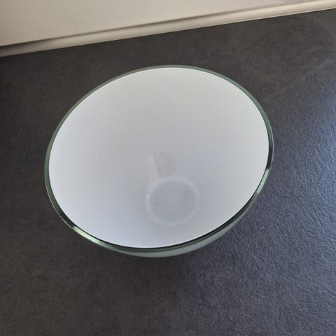 Holmegaard Cocoon skål i hvidt glas (Ø: 25 cm) sælges. Den har et lille skår - se billeder.