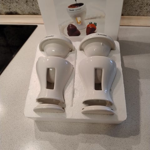 Ny chokolade smelter til 2 personer i hvid porcelæn. Aldrig været ude af æsken , så det sker nok ikke . Jeg har muligvis et nyt sæt mere i mit sommerhus .