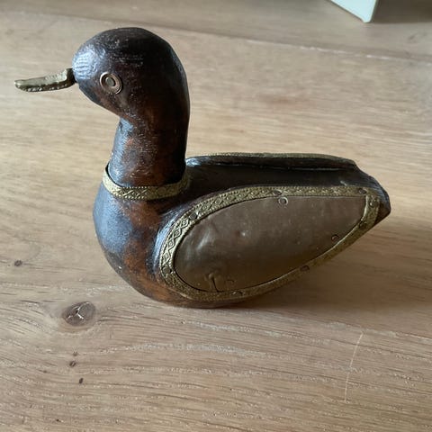 Lille pynteand fra 60’erne med perlemor- glasur i skønne farver. Anden er 10 cm i højden. (13)
