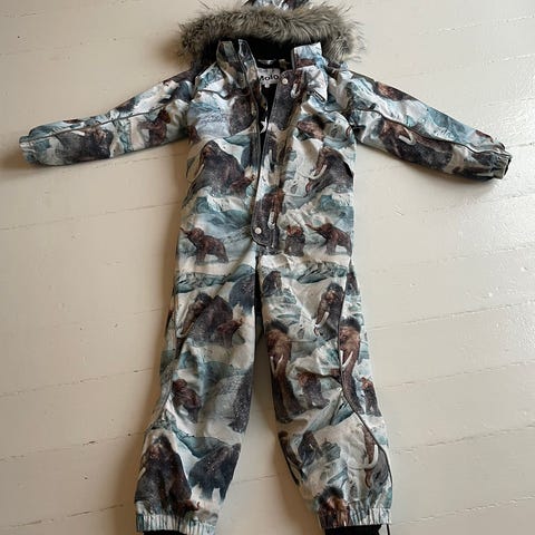 Molo flyverdragt str 128 (solgt), lyserøde flyverdragt: 116 - 122, lilla plettet flyverdragt str 110 - 116, orange stribet jakke 128, overtræksbukser 116 - 128, Bundgaard støvler str 34