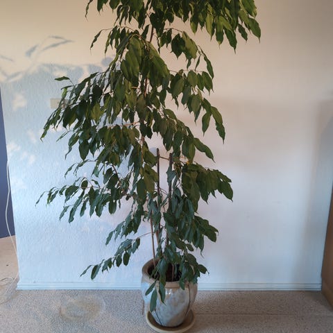 Kæmpe stuebirk af 4 flettede stammer. Højde over to meter. Sælges med fletkurv. Planten er rask og sund. Nu sat ned med kr 200,-