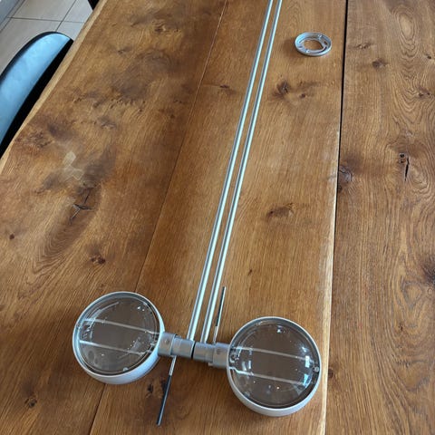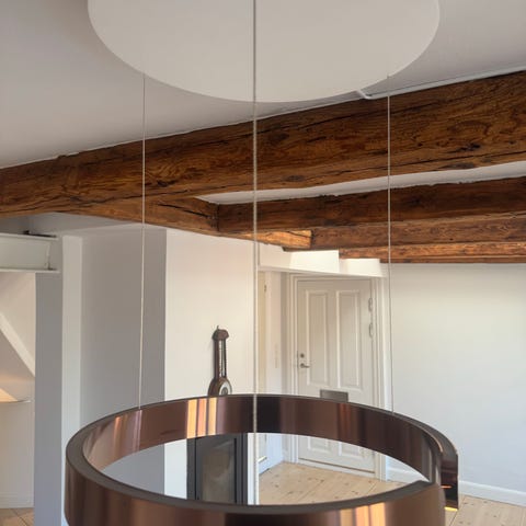 Pendel, Occhio Mito Sospeso 40, Farven er bronze, men fremstår mere som guld. Variabel længde. Uden ‘Occhio air’. Uplight og downloght kan tændes og dæmpes enkeltvis på lampens sensorer. Kan også tilkobles dæmper på vægkontakt. Temperaturen på lyset kan varieres fra koldt til varmt lys.