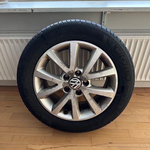 4 Rial fælge med dæk. Det ene dæk er defekt. Inkl bolte