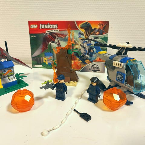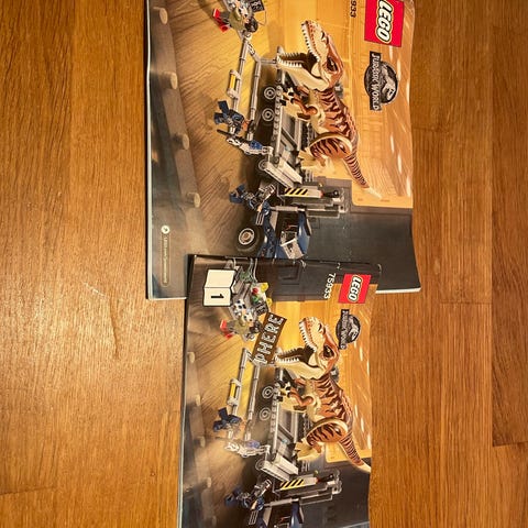 Super flot Jurassic World LEGO som har 4 dinosaurer, to biler, to bure, en helikopter og en kæmpe indgang. Få brikker mangler og derfor er prisen sat ned.
