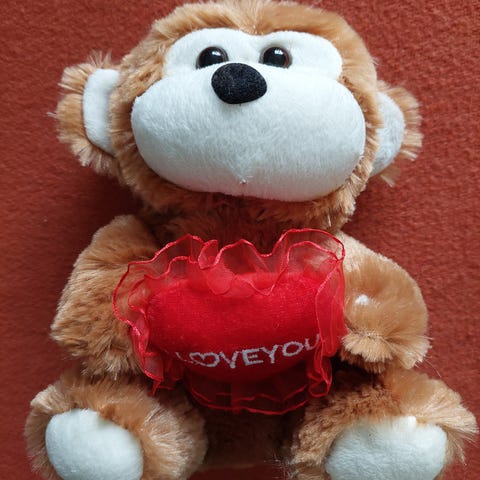 Sød abe der er lavet, så den slår koldbøtter, hvis man vender dens hoved nedad. Er som ny, har kun stået til pynt.