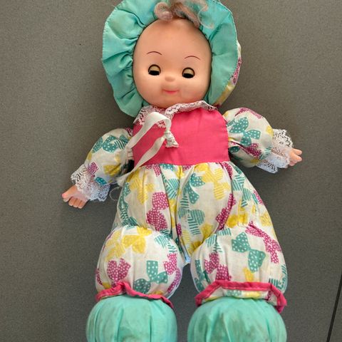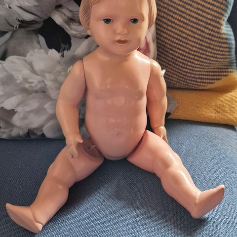 Fin gammel dukke med brugsspor. Lyse blå øjne som lukkes når dukken ligger ned. Længde ca 45 cm