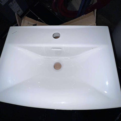 Laufen håndvask ny str 56x42 hvid. Billeder i og af papkasse, samt et billede af en anden som er monteret.
