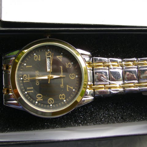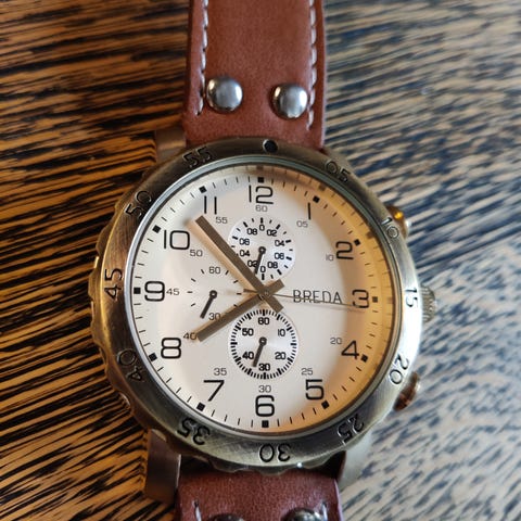 Et flot welder ur, med blåt glas, med camo farvet rem, og rustfri lænke. Det står som nyt. Mangler dog at få skiftet batteri.