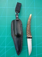 Håndlavet lille jagtkniv opført i rustfrit stål med håndtag af dansk kronhjort.