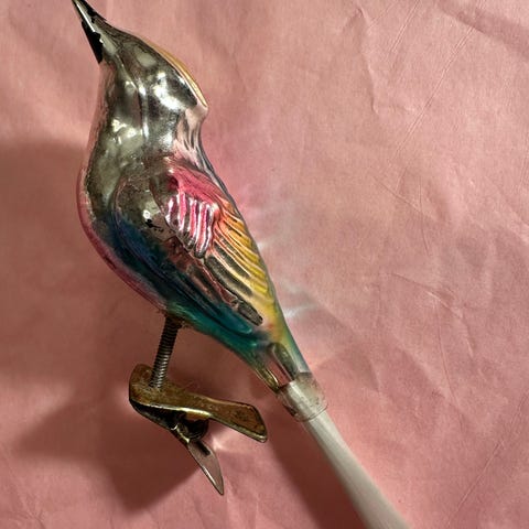 Smuk speciel større spurv på 9 cm og med halen udtrukket 14 cm. Fuglen har to fjedre ig sidder på gammel original clips.