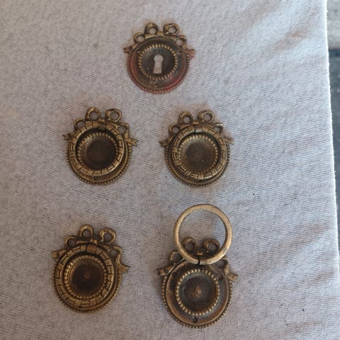 Incl. div. gamle porcelænsting: rosette, lille bæger, knop, klunke til ende på gardinsnor.