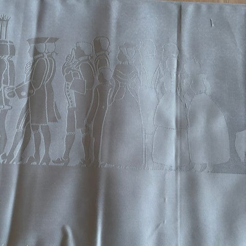 Ubrugt aldrig vasket Arne Jacobsen damask dug fra Georg Jensen i farverne antracit/natur. Denne farvekombination er udgået.