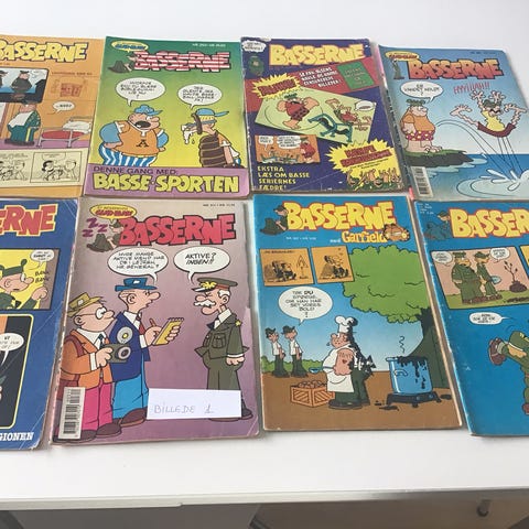 19 tegneserier sælges: Basserne (3 stk.), Valhalla (2 stk.), Asterix (5 stk.) og Blåfrakkerne (9 stk.).