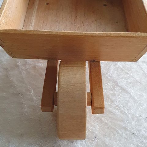 Fin "cykelvogn" i træ og malet. Håndlavet og fint dansk håndværk. Med stort rum. Totallængde 28 cm. Bredde 17 cm. Højde ca. 25 cm. Hjul kan ikke køre rundt.