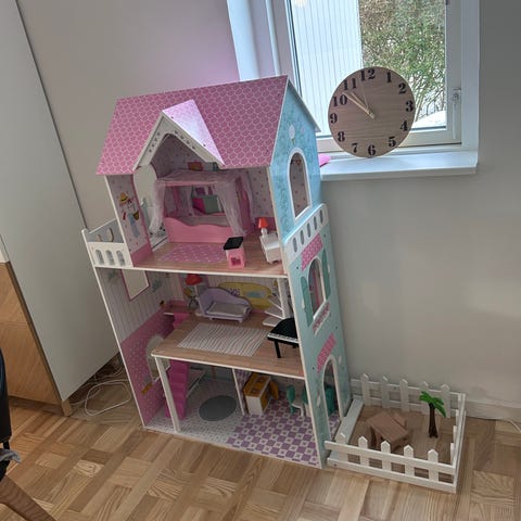 Flot dukkehus i træ fra Woodlii med hele 3 etager og massere af tilbehør.