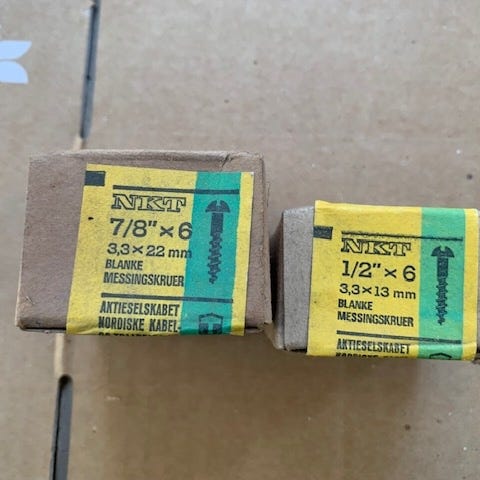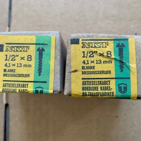 2 pakker NKT blanke messingskruer med rundt hoved og lige kærv: 1 pakke 4,8x 13 mm, og 1 pakke 4,8x32 mm. 1 gros (144 stk) i hver pakke, altså i alt 288 stk. Helt nye og uåbnede pakker. Nypris 485 kr pr. Pakke, i alt 970 kr. Køb til ca. 30% af prisen.