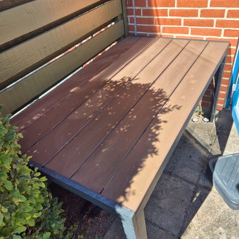 Havebord med bordplade i kunstigt træ. Stel og ben i polyrattan og pulverlakeret stål. Hylden under bordpladen er ideel til opbevaring af mindre genstande som magasiner og dækkeservietter.