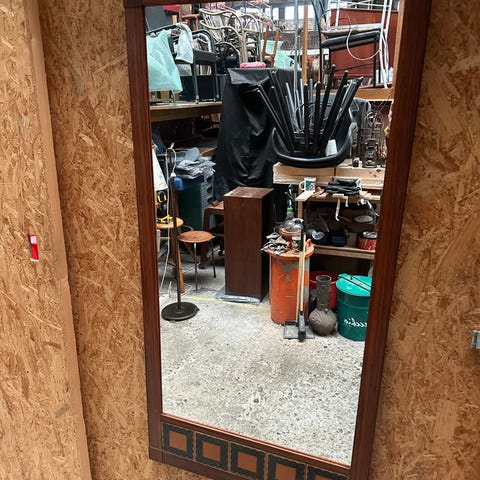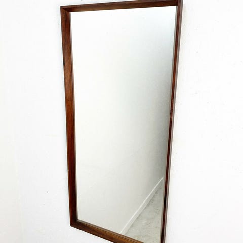 palisander spej fra 1960’erne. Spejlet har en kobbe belægning bagpå, som får spejlet til at få en flot rosa farve. Spejlet er i en flot original stand med meget små brugsspor.