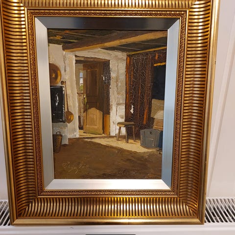 Oliemaleri, Vagn Ove Schnack, motiv: Andet, stil: Naturalistisk, b: 54/40 h: 40/32, interiør, i flot guldramme.