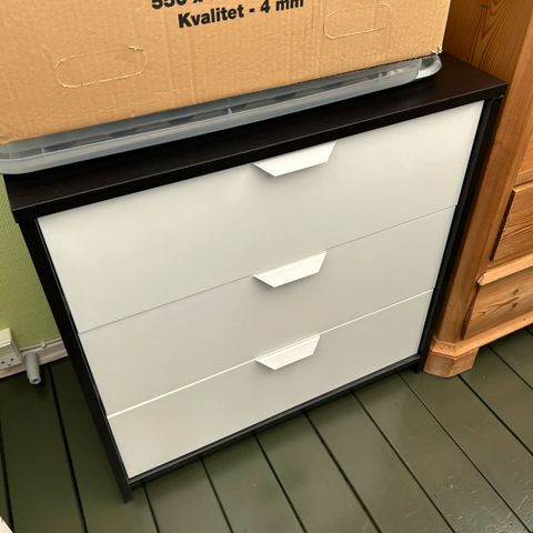 Flot sort kommode med 2 skuffer. 85 cm højt, 36 cm dybt og 95 cm bredt.