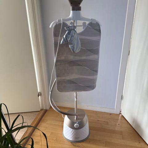 Damperen inkl. højdejusterbar stang med “strygebræt” og en bøjle, så du nemt kan bruge damperen på dine skjorter, kjoler eller bukser. Stangen er teleskopisk, hvilket gør opbevaring mere praktisk.