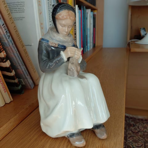 Siddende Amager pige med sytøj nr 1314 h: ca 15 cm