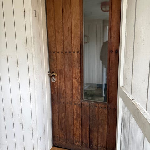 Man kan se skruehuller øverst til venstre hvor der engang har siddet en lukkearm og øverst til højre hvor der engang har siddet en klokke.