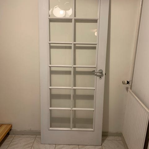 Glasdør, træ, b: 96 h: 230, 1 Stk. Gammel butiks dør fra Haderslev. Indsat som ny dør i 1958. Glasset er intakt. Døren står uden defekter.