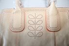 Taske af lys beige læder med orange kanter og gyldne beslag, en rum med 3 indvendige lommer, heraf en med lynlås, samt en nøglestrop. Orange for af stof. Inkl. dust bag.
