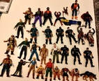 Samling af actionfigurer fra forskellige mærker i blandede størrelser og farver. Figurenes materialer varierer, og de repræsenterer forskellige karakterer og temaer. Egnet til samlere eller som legetøj.