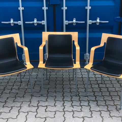 Stole fremstillet af Ansager Møbelfabrik udført i sort træskal med skumpolstring og blødt sort (ægte) læder samt metal stel med krom finish. Gode og bløde at sidde i med god lændestøtte pga buet ryglæn. Kan også bruges som kontorstole. Nypris 3600 kr. pr. stk. Min pris i annoncen er pr. stk. Sælges kun samlet. Prisen er fast.