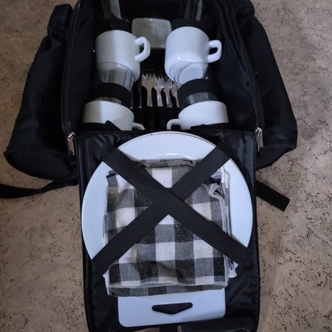 lille rygsæk - blå med indhold af krus mm til hygeture ud i naaturen