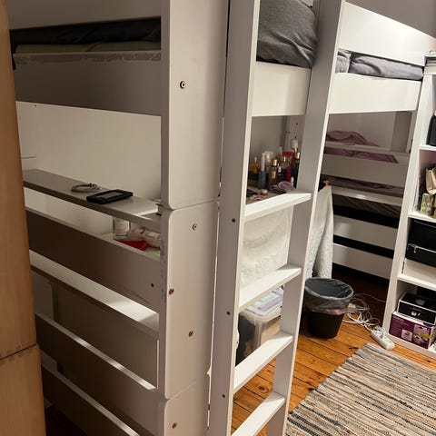 Udover seng og madras, er der et bord og lommer til at hænge på kanten af sengen. Som følger med. Sengen er skilt og klar til afhentning.