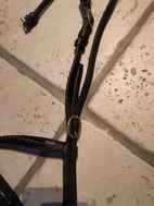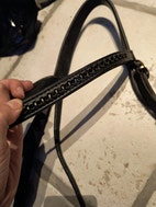 Fint hovedtøj med kæberem fra ukendt mærke i str. cob. Pandebåndet er fra Karlslund.