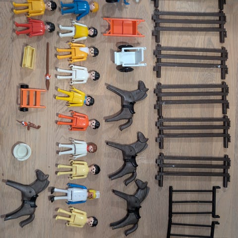 Gammelt Playmobil kender i årstallet fire heste 12 figurer og de dele du ser på billederne