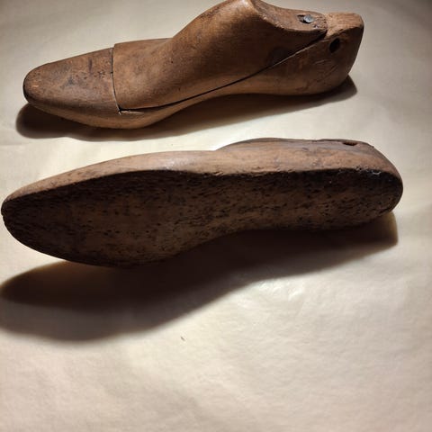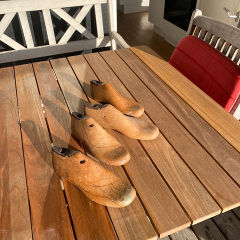 Gamle dekorative børne sko lester fra omkring 1900-tallet. Har ormehuller og en med revne i træet
