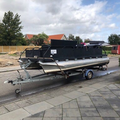 Ponton båd med sorte sider, låge i fornt og begge sider.