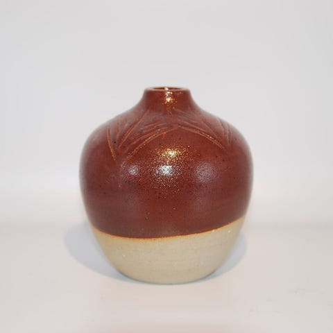 Keramik, Vase, Tykt drejet vase lavet i lertøj. Orange og brun glasur. Jeg kunne forestille mig at den er fra 1940'erne eller 50'erne. Den er signeret 20e i bunden, måske det er en pottemager elevs nummerering? Det kan også være den er ældre end antaget og det er fra efteråret 1920. Vasen fremstår flot og intakt med ujævnheder og glasurbobler. Den måler 16,7 cm høj og vejer 1125 gram.
