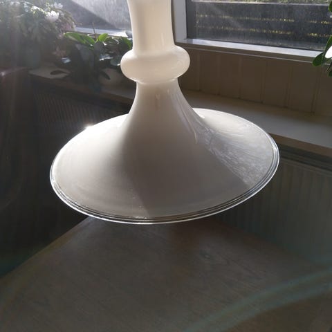 Etyde glaslampe fra Holmegaard med diameter på 37 cm. Designet af Michael Bang. Opaliseret glas som giver et blødt lys ud i rummet uden at blænde. Med 110 cm ledning og fatning til elpære med stor sokkel/E27. Med en lille revne jf. billede 4