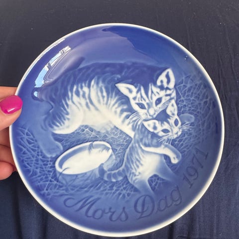 Bing & Grøndahl Mors Dag 1978 samlerplatter i blå og hvid. Platterne har motiver af katte, herunder en med teksten 'Kattens Værn 1933-1983'. Velegnet til samlere eller som dekorative elementer i hjemmet. Platterne er udstyret med ophæng på bagsiden.