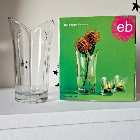 Glas, Erik Bering vase, Iittala, Flot retro vase designet af Heikki orvola i samarbejde med Erik Bering. Original æske og alle dele medfølger. Højde 14 cm, bredde 22 cm.