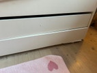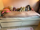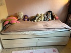 Super god seng fra Ikea med mange gode år endnu. Skuffen skal fikses men fungerer. Klistermærker kan vaskes af. Ellers pæn.
