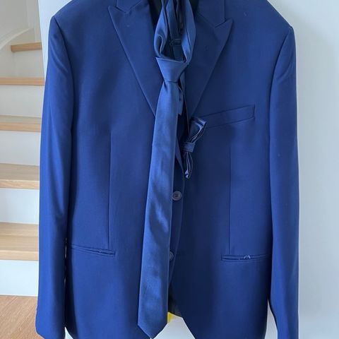 Blåt drenge jakkesæt med mønstret foer, er kun brugt en gang. Mærke: Isacc Dewhirst, str 42