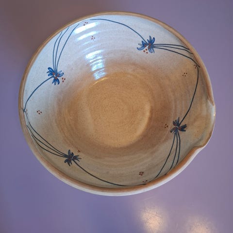 Dejfad fra Eslau med hældetud , højden er 14 cm , diam er 28 cm .Der er enkelte brugs ridser i bunden .