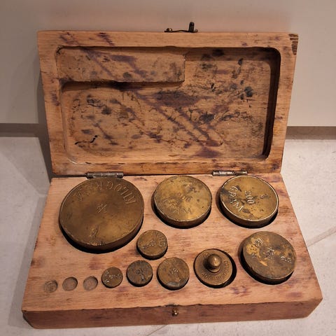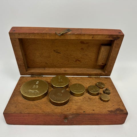 Andre samleobjekter, Messing vægtlodder, Et sæt med 8 kgl. Stemplede messinglodder fra 1926 i trækasse. 2x200 gr + 1x100 gr + 1x50 gr. + 2x20 gr. + 10 gr + 5 gr.. Sælges til fast samlet pris + evt DAO fragt.