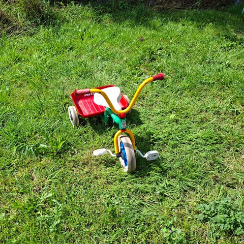Ældre Winther trehjulet cykel med lad, ideel til dekoration eller et restaureringsprojekt. Den klassiske røde model har tydelige brugsspor, patina og rust, særligt på ladet, hvor der er rusthuller. Styr og pedaler fungerer stadig, men cyklen trænger til en kærlig hånd.